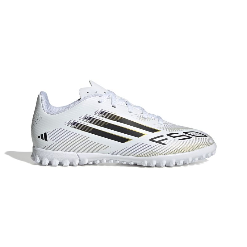Encuentra tu velocidad para expresarte al máximo en el campo. Siente la adrenalina con los tacos adidas F50, diseñados para la velocidad. Estos zapatos de fútbol Club para jóvenes te mantienen cómodo cuando estás en movimiento con un exterior de material sintético ligero y una lengüeta perforada. Dales la vuelta y encontrarás una suela de caucho con taches que favorece el juego rápido sobre césped artificial.